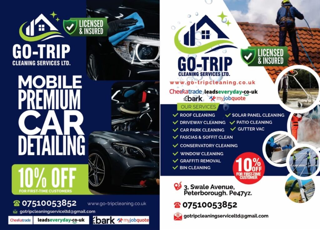 Go-Trip Cleaning Services Ltd is a professional cleaning company based in Peterborough, Cambridgeshire. We specialise in both interior and exterior cleaning solutions, providing reliable, eco-friendly, and high-quality services tailored to the needs of our customers. Our team is dedicated to excellence, making sure your home, office, or vehicle looks and feels refreshed.